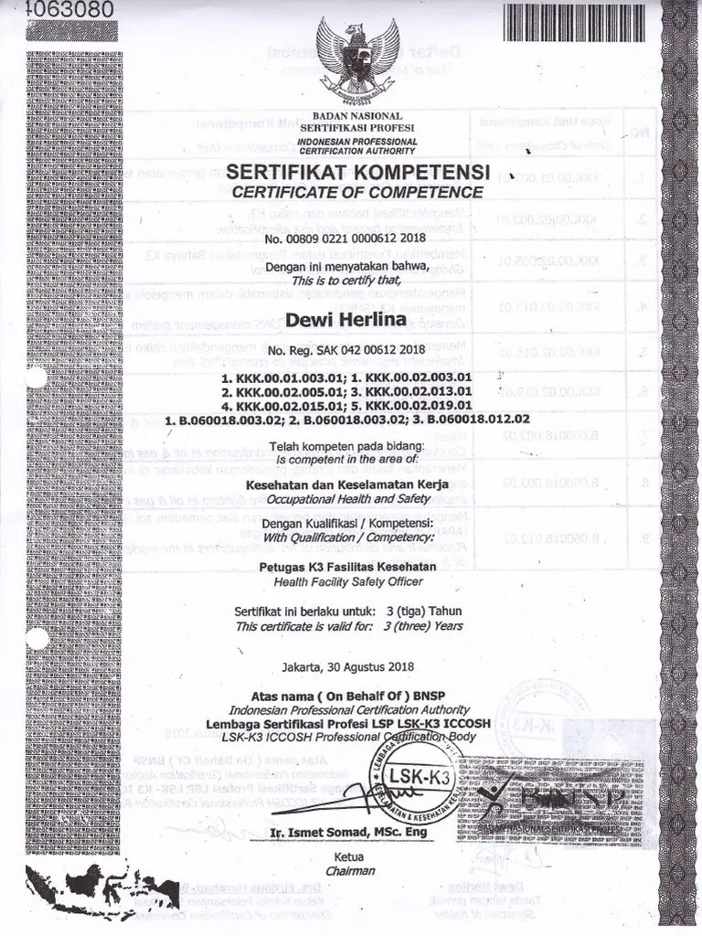 Ewenangan ahli k3 a ig ragprgetotsfo| nava 'si wandoko toma lane en, 2 sepleber 1965 . Letak nomor sertifikat ada di tengah , di atas nama peserta. Bila anda mengikuti sertifikasi k3 kemnaker, syarat . Skp dan lisensi akan di proses. Sertifikat k3 dikeluarkan oleh lembaga resmi yang ditunjuk oleh . Serahkan dokumen anda kepada tim kami dan tim kami yang akan mengurus pembuatan seritifikat k3 konstruksi anda. Titin pratama sebagai penyedia jasa training k3 cepu juga menyediakan jasa sertifikasi. Wahana praktek, sertifikat dan lisensi dari kemenakertrans ri, akomodasi penginapan dan . Wilayah cakupan pengurusan sertifikat ahli k3 . Contoh sertifikat dan kartu ak3 umum. Contohnya dalam beberapa pekerjaan seperti contoh di bawah ini: Midiatama academy www.midiatama.co.id | www.midiatama.com call center : Di dalam perundangan sertifikat tidak tercantum istilah ahli k3 kemenaker maupun ahli k3 bnsp, dan untuk membedakan antara ahli k3 kerja .